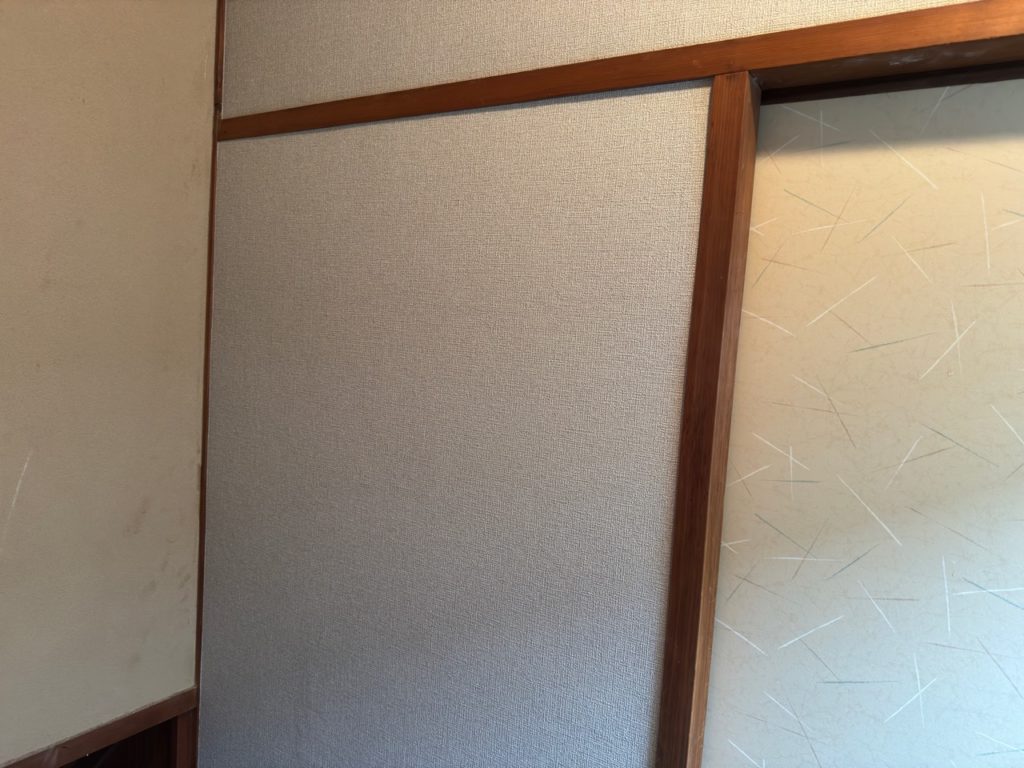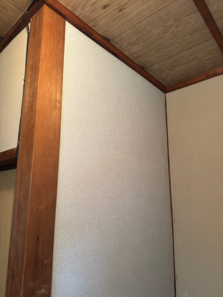 既存の聚楽壁の上にベニヤを重ね張りし、その上からクロスを施工しました。