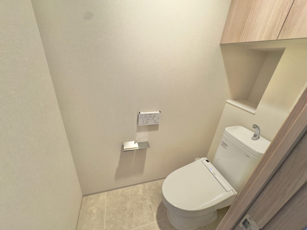 - トイレは木目の収納と調和する落ち着いた色で空間を引き締め