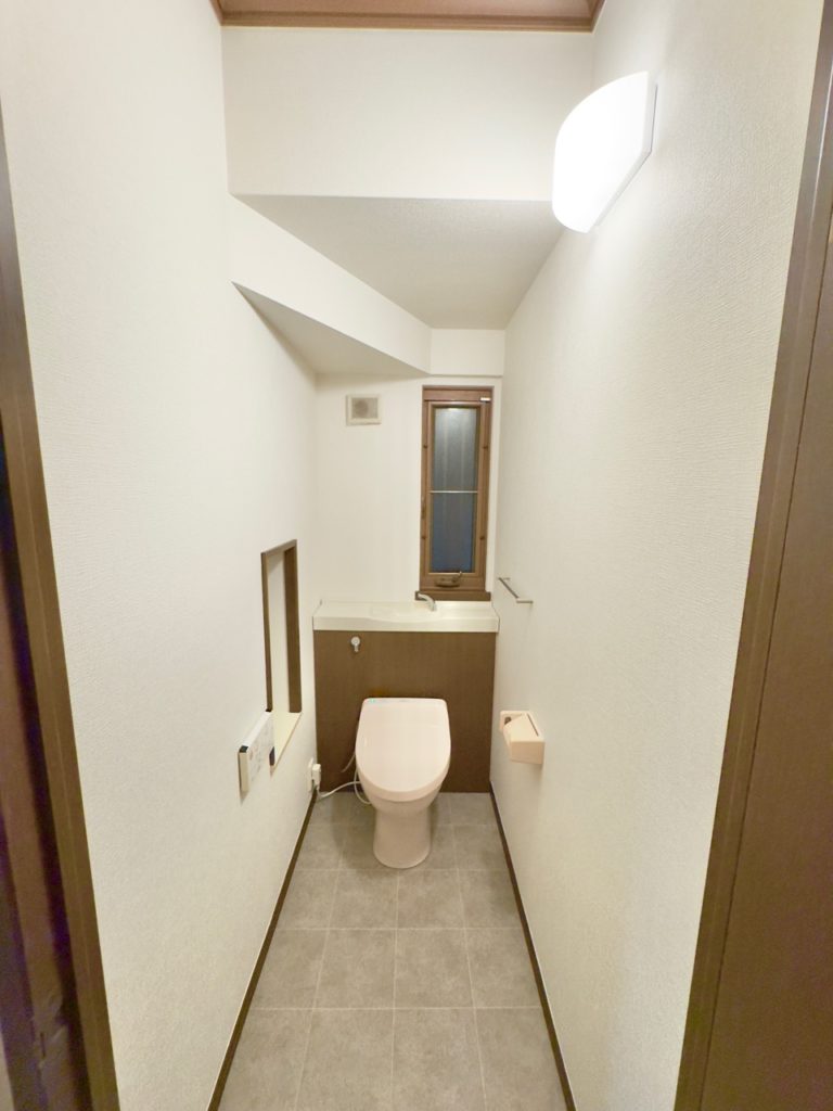 明るい色の床材により、トイレ全体が広く見える空間になりました。