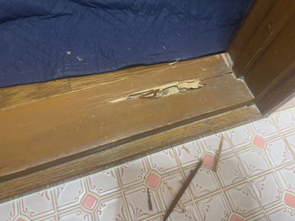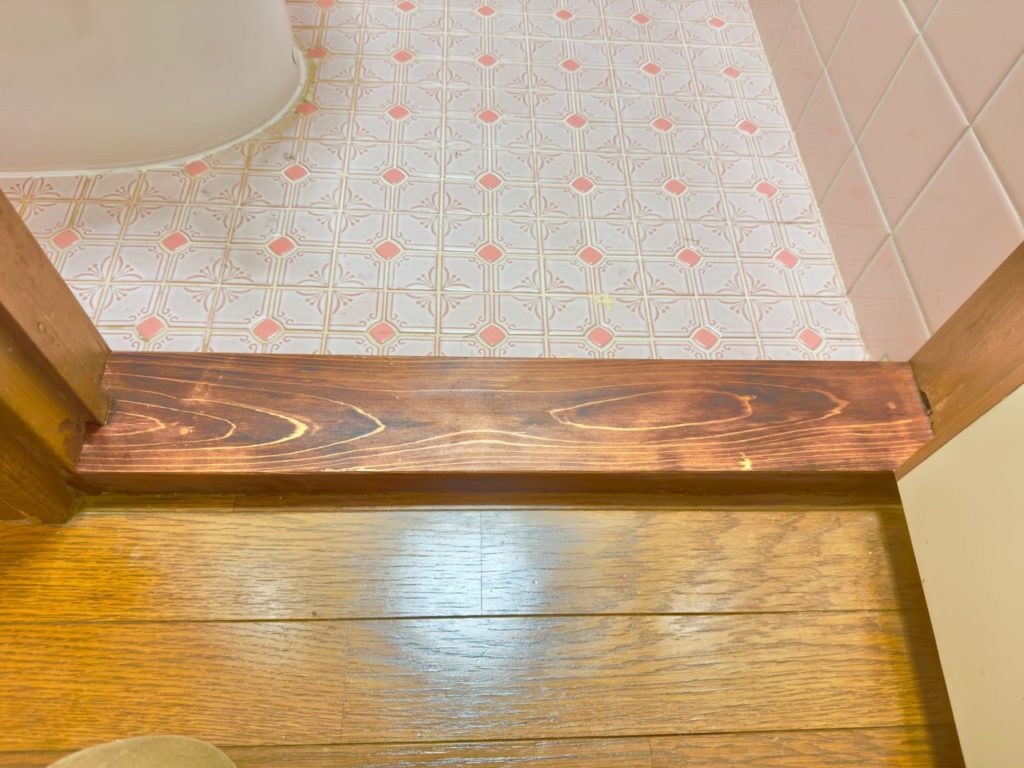 また、入口の敷居部分にシロアリの被害があり、劣化が進んでいる状態でした。放置するとさらに被害が広がる恐れがあるため、同時に取り替えを行うことになりました。