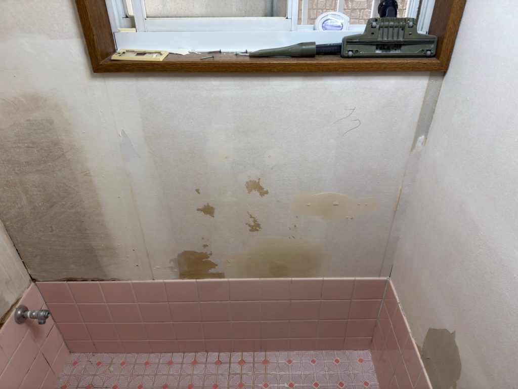 まず既存の便器とクロスを撤去。クロスを剥がすと、壁下地に凹みやひび割れ、段差が多数見つかりました。