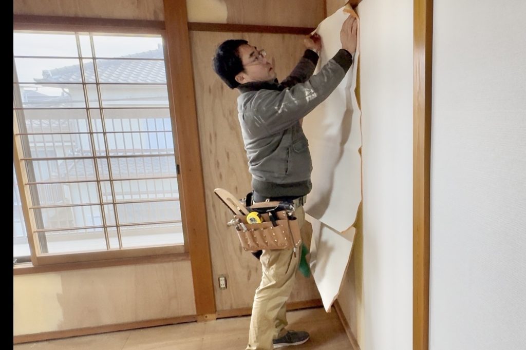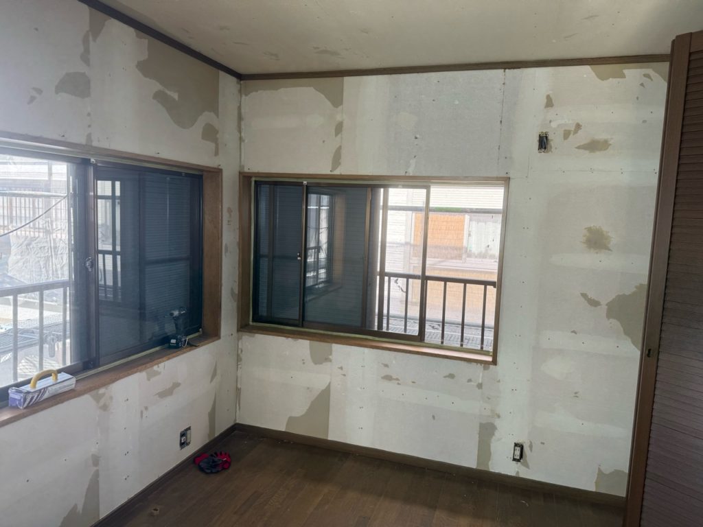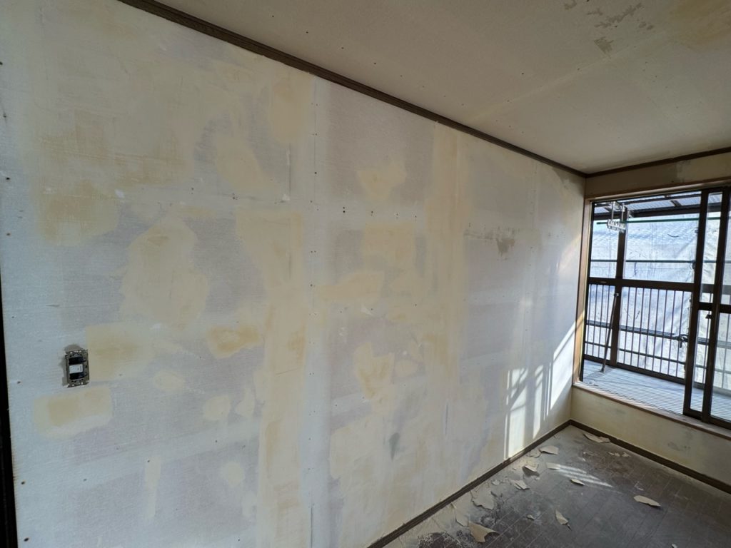 通常よりも時間をかけてクロスを剥がした後、下地処理(全面パテ)にさらに2日程度を要しました。