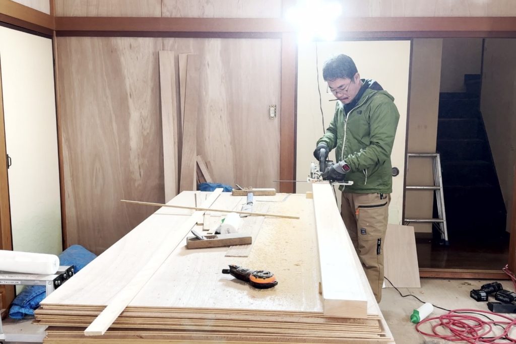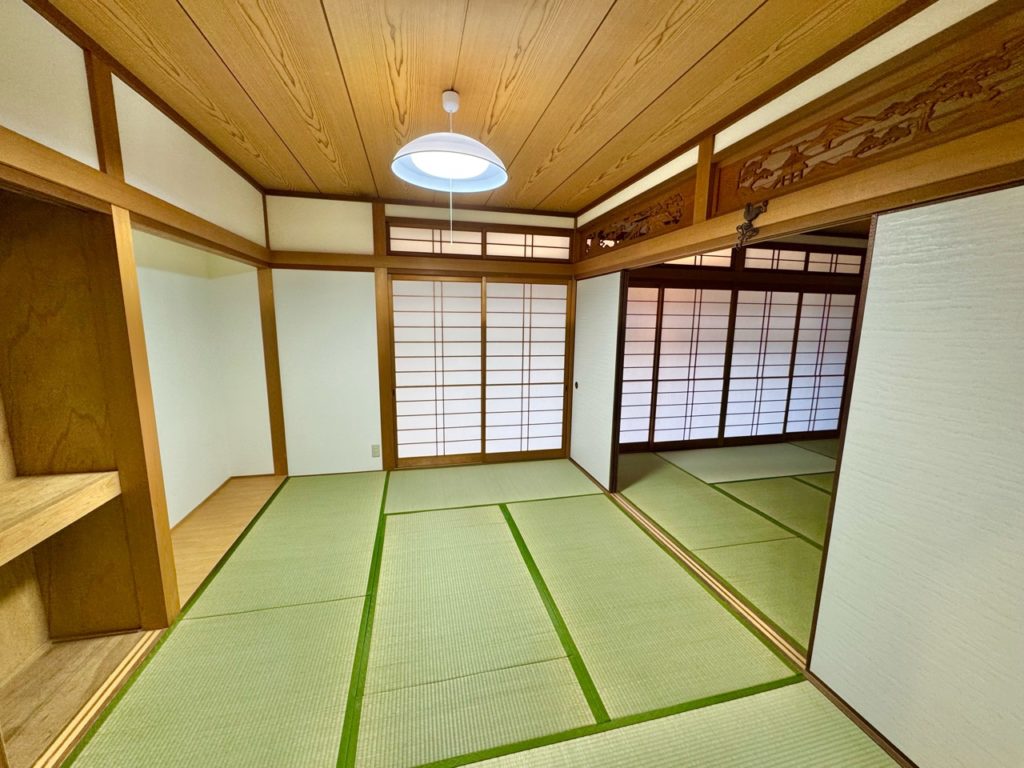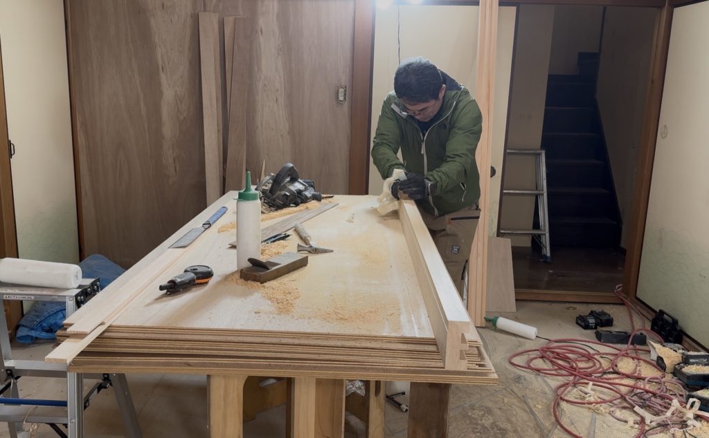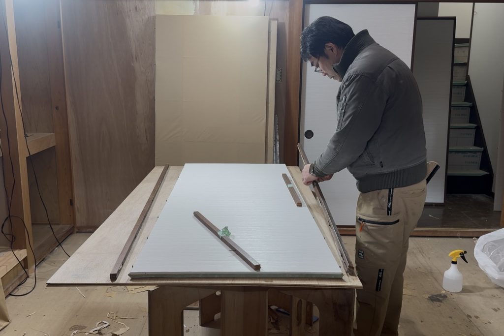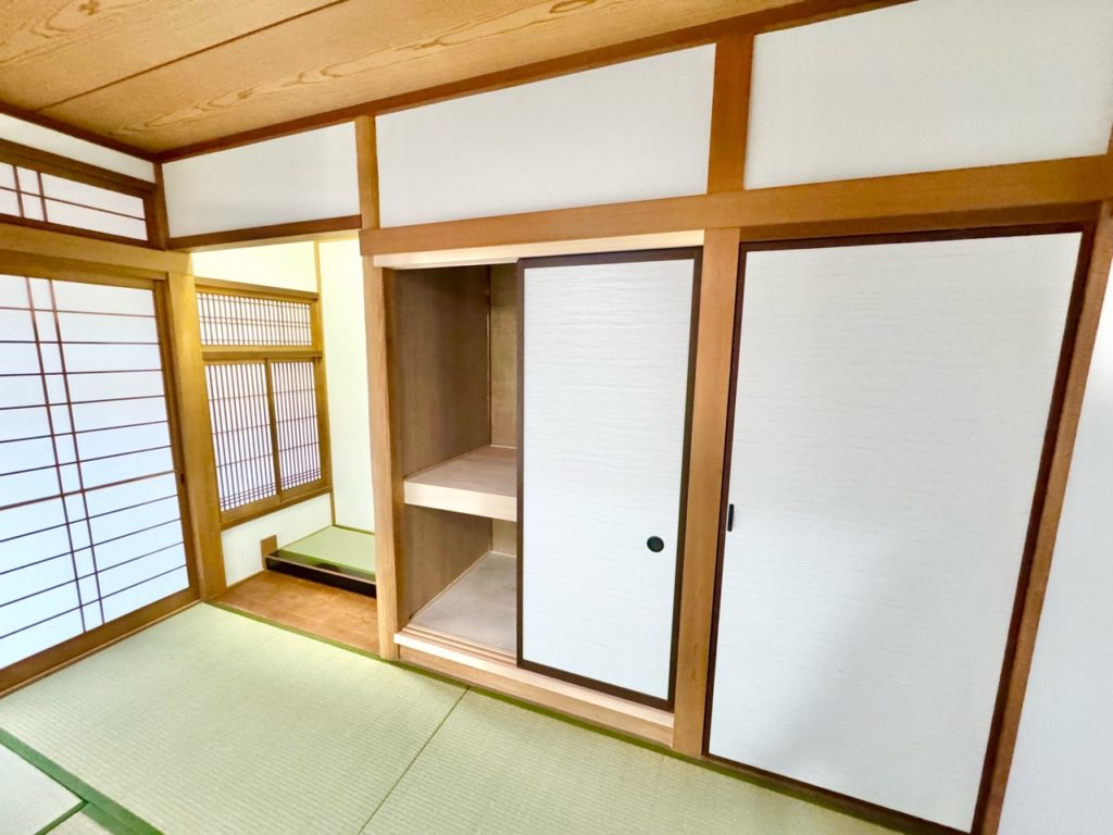 仏間は撤去し、押入れへ造り替えました。鴨居・敷居は現場寸法に合わせて加工し、鉋で削って入れ替えることで建具の精度を整えています。襖・障子は外注ではなく山下が張り替え、建付け調整まで行っています。和室の雰囲気を残しながら、実用性と使い勝手を改善しました。