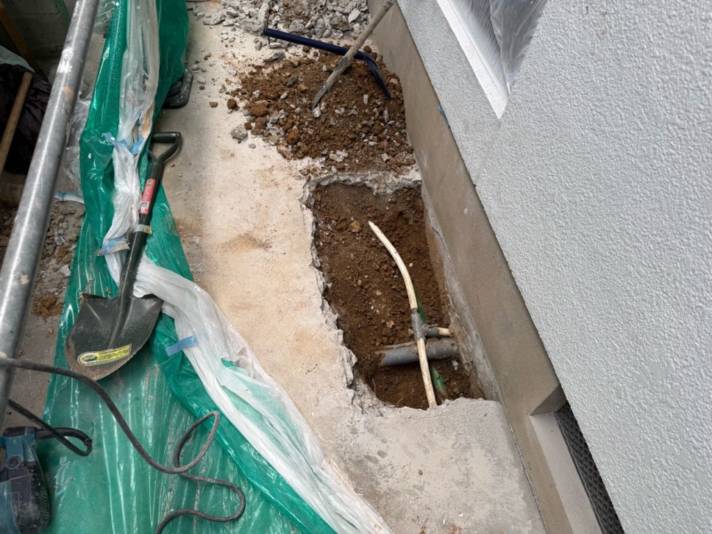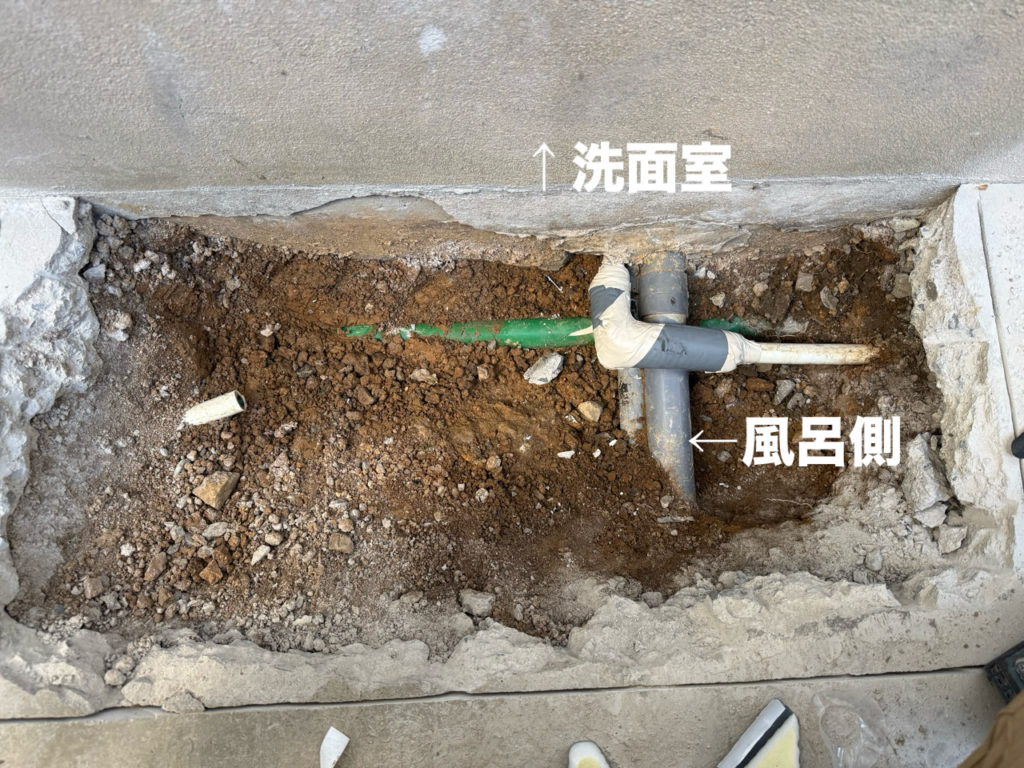洗面室の外側に分岐点がありました。コンクリートを斫りとり掘削したところです。