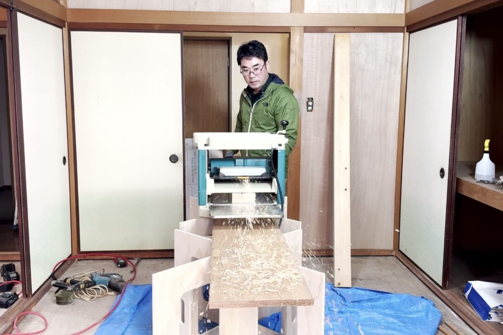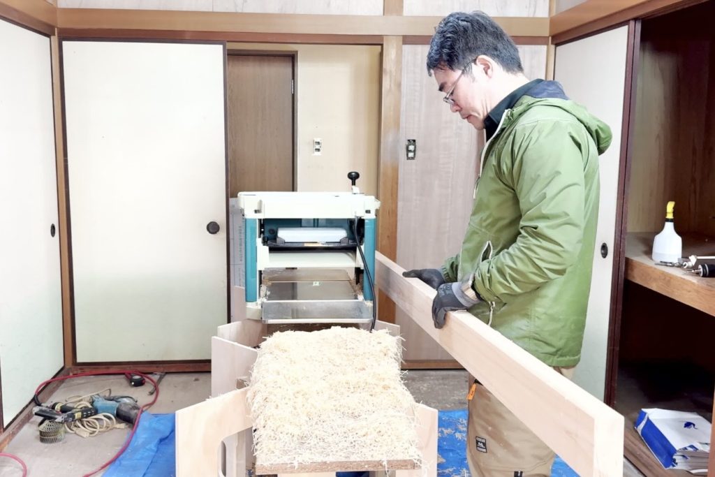 仏間軸回しの撤去後、既設の鴨居敷居と同じ厚みに加工していきます。