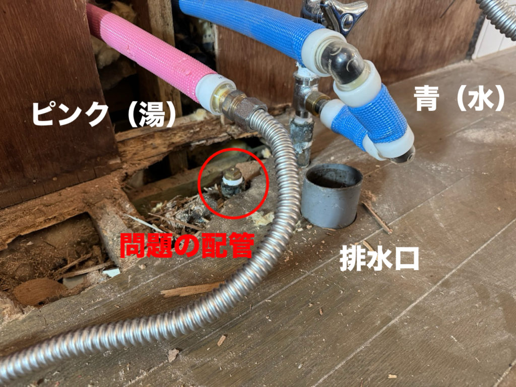 ところが、赤丸の配管は「昔の給湯配管が途中で止まったまま」床下に残されている状態。蓋を緩めると水圧がかかっており、水が溜まったままになっていました。